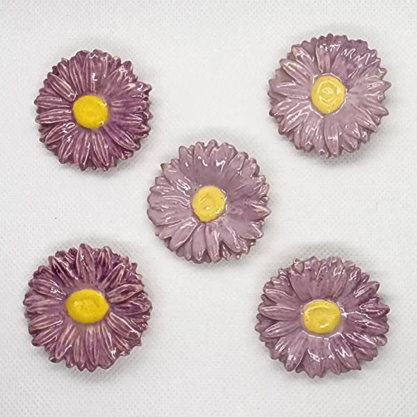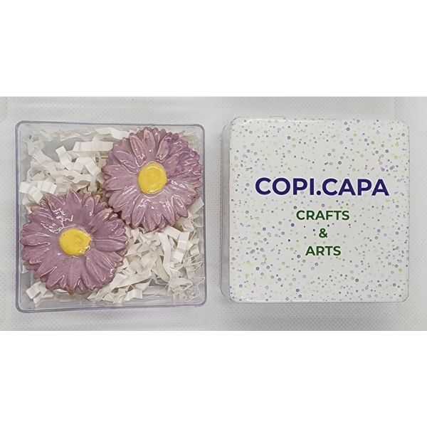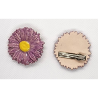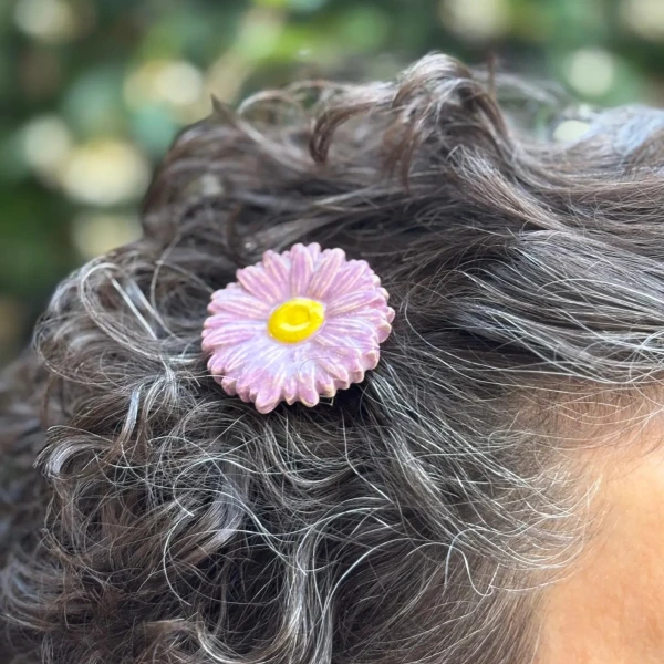 We use a special ceramic clay that becomes soft with the addition of certain mineral powders and hardens at firing temperatures between 750°C–1300°C. The brooch is first shaped by hand, then fired in the kiln to create what is known as a "biscuit" piece. This raw piece is then glazed or painted using ceramic-safe materials and fired again for durability and vivid colors.
